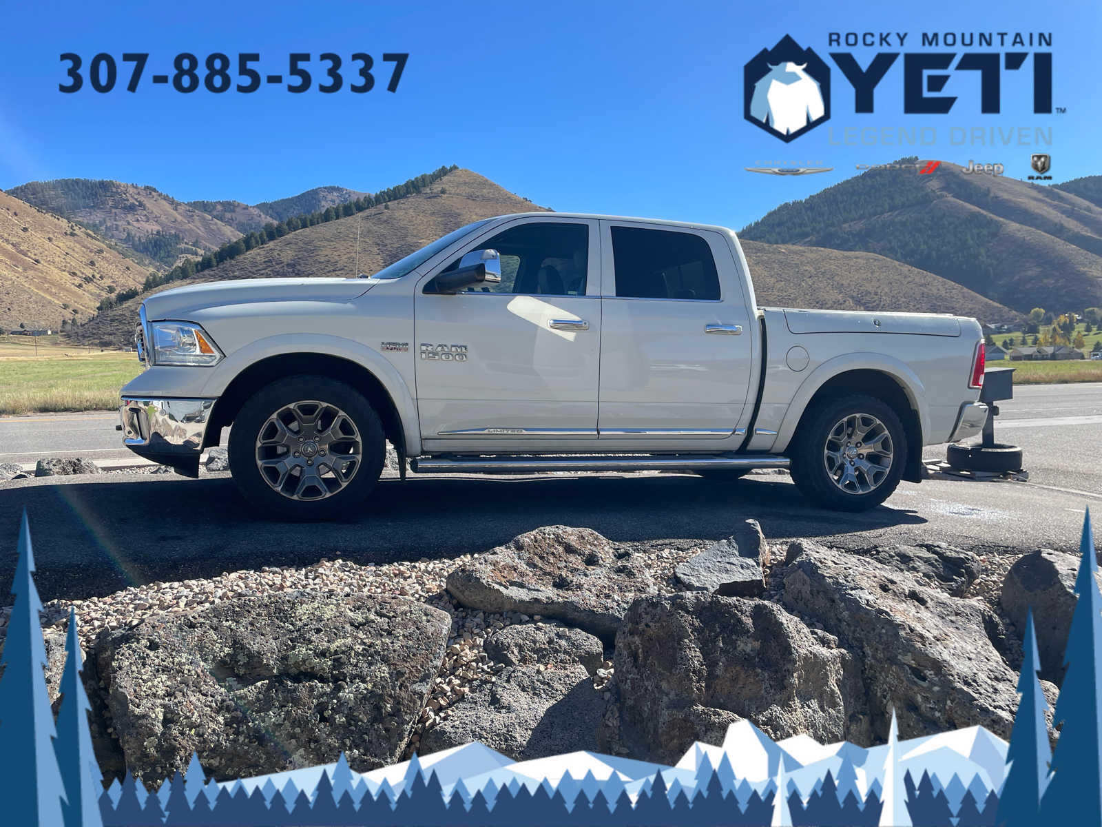 Engine: 5.7L V8 HEMI MDS VVT, Transmission: 8-Speed Automatic (8HP70), Luxury Front & Rear Floor Mats, Chrome Bodyside Molding, Wood/Leather Wrapped Steering Wheel, Ram 1500 Badge, Chrome Ram Badge, Chrome Grille w/RAM Letters, Leather Wrapped Grab Handle, Body Color Front Fascia, Body Color Rear Bumper w/Step Pads, Chrome Belt Moldings, Delete Tow Hooks, Laramie Limited Group, Limited Tailgate Applique 4x4, Luxury Door Trim Panel, Laramie Limited Cluster, Black Closeout Trim, POWER SUNROOF, Trailer Brake Control, Power Chrome Trailer Tow Mirrors, Trailer Tow Mirrors.